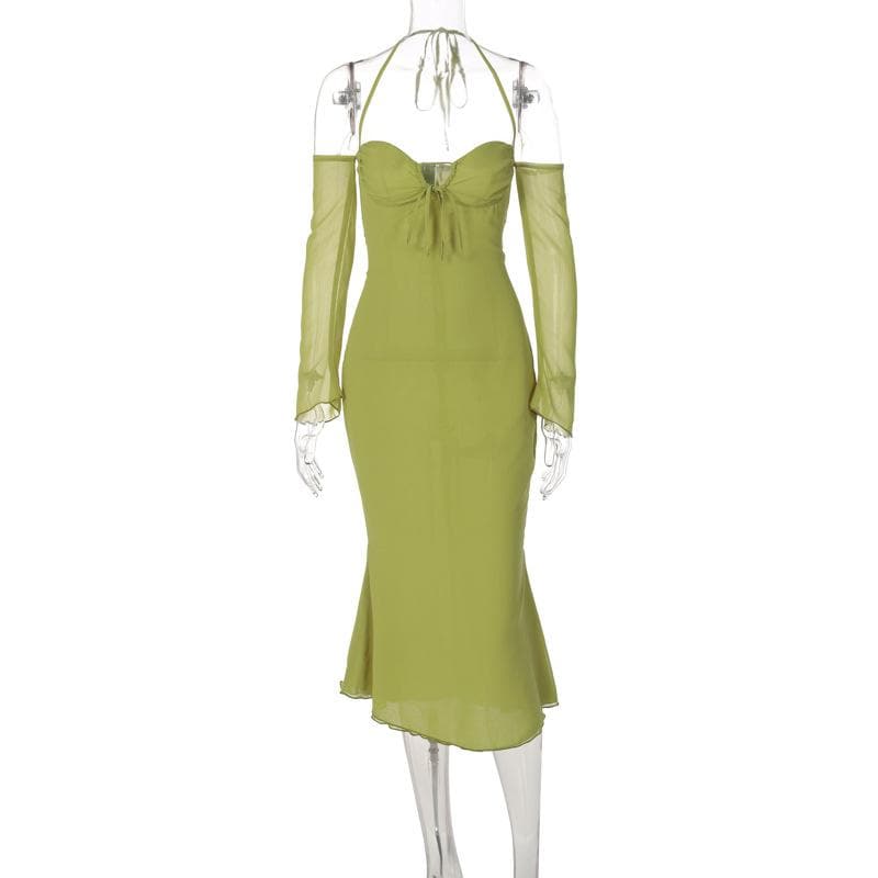 Be the first to review “Low cut halter off shoulder long flared sleeve midi dress”