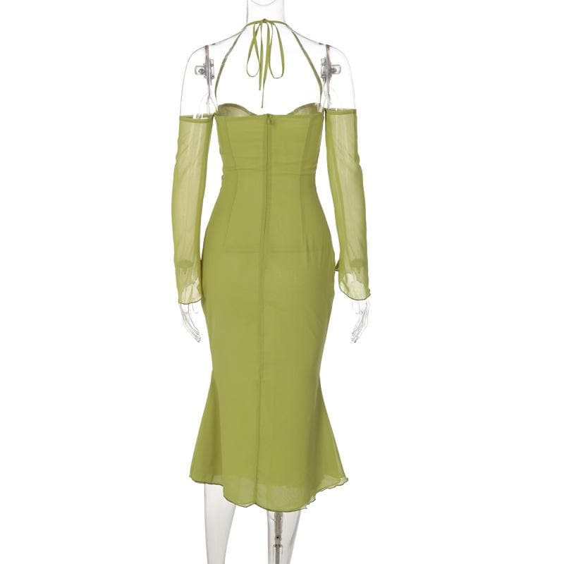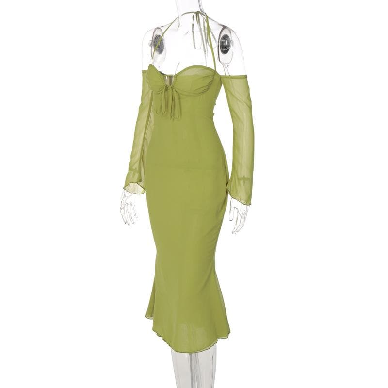 Low cut halter off shoulder long flared sleeve midi dress