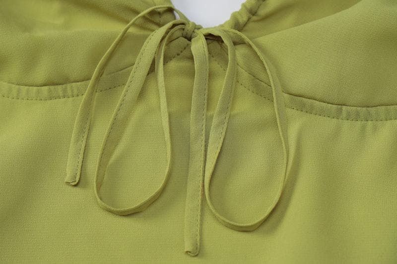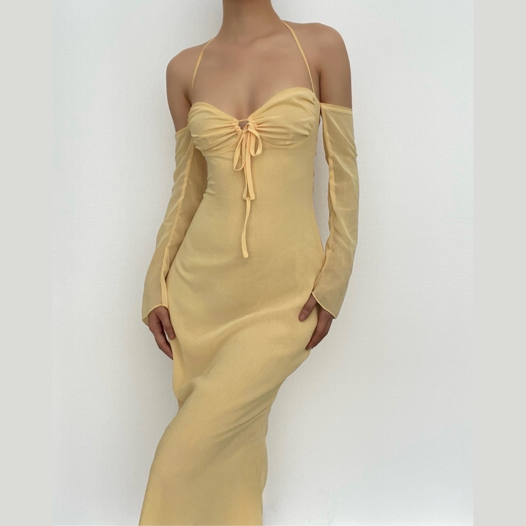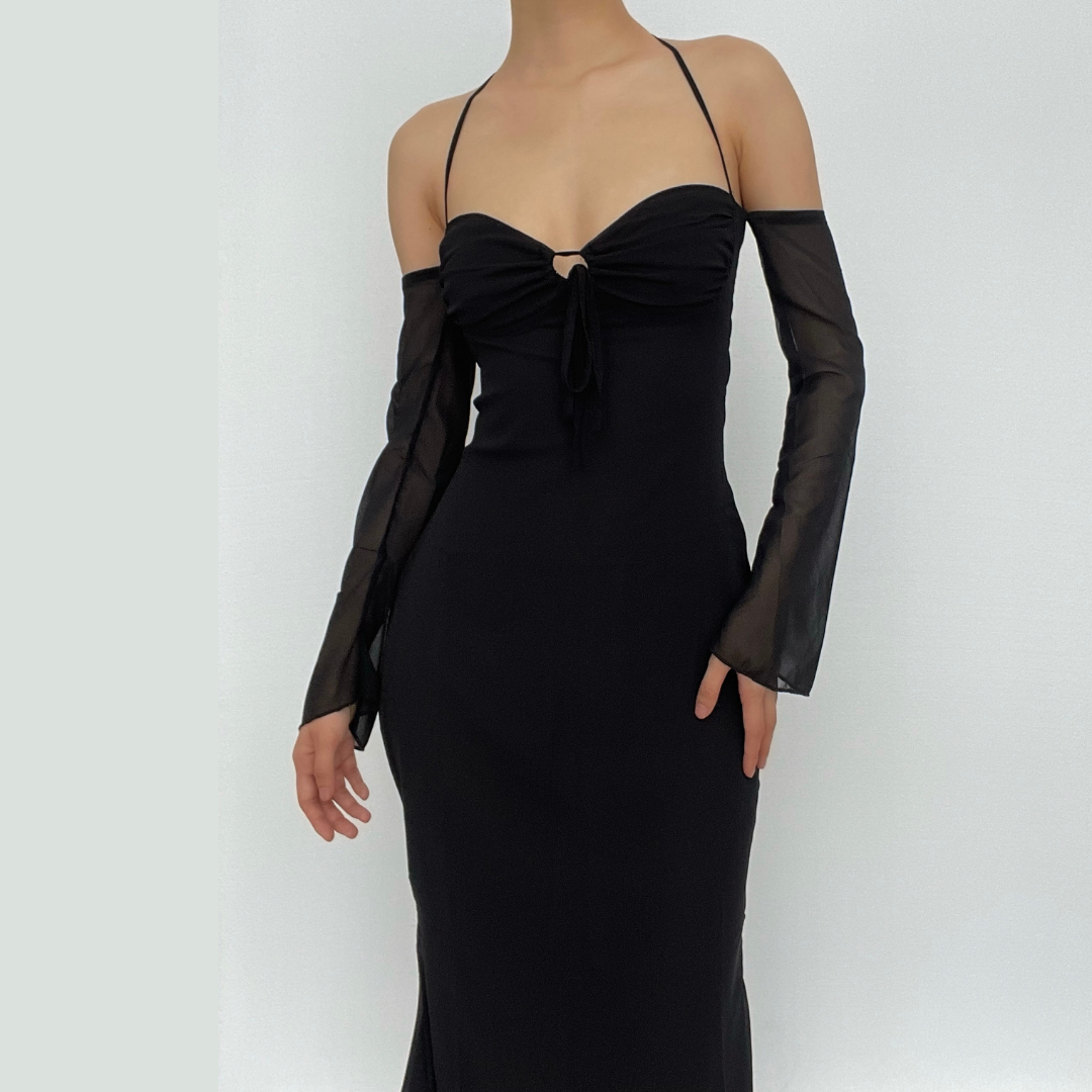 Low cut halter off shoulder long flared sleeve midi dressLow cut halter off shoulder long flared sleeve midi dress