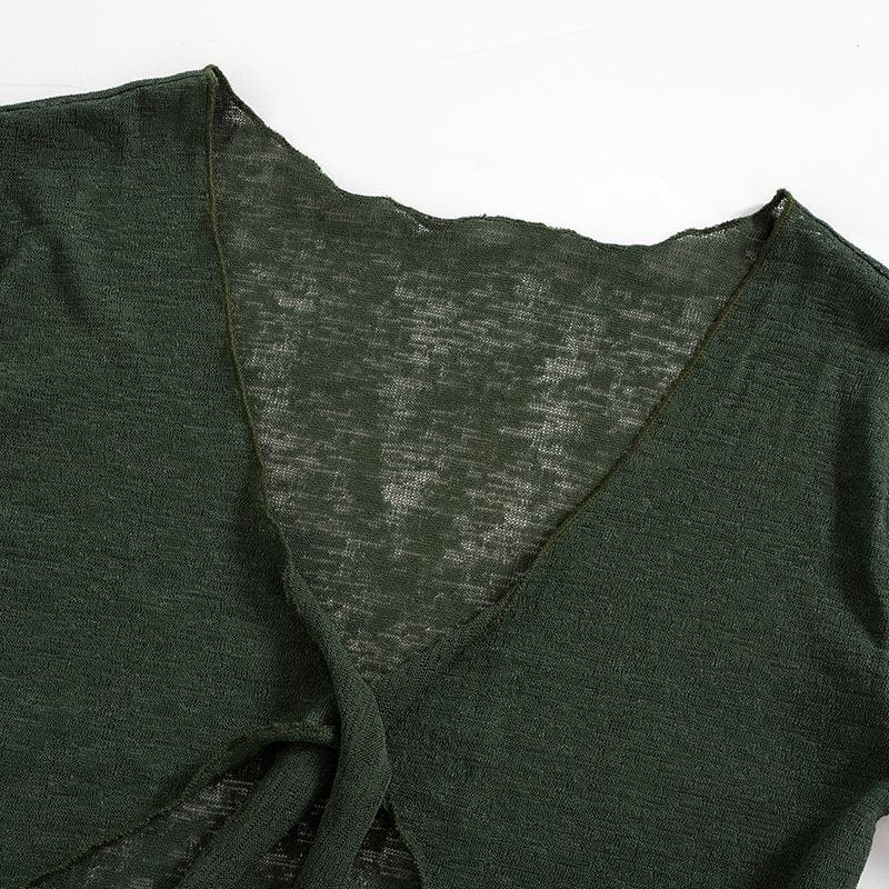 Sheer mesh see through v neck knotted irregular long sleeve skirt setSheer mesh see through v neck knotted irregular long sleeve skirt set